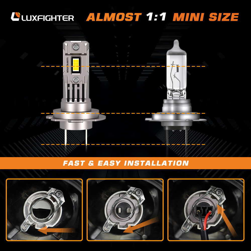 Luxfighter H7 LED đèn pha Bóng đèn 60W 6000LM 1: 1 đến Halogen Light cung cấp một giải pháp đầy đủ về đèn LED cắm và chơi trực tiếp. Q26 là đèn LED ô tô Plug-Plug-Play nhỏ nhất với quạt làm mát tốc độ cao tích hợp. Siêu sáng, mô hình chùm tốt với cắt ánh sáng hoàn hảo. Các chip LED LED ô tô tùy chỉnh 45 Mil 8 Mil 8-Core nâng cao. Q26 có kích thước 1: 1 thực sự với bóng đèn halogen gốc. Đây là các mô hình Plug-Play thế hệ thứ 4 của Luxfighter.